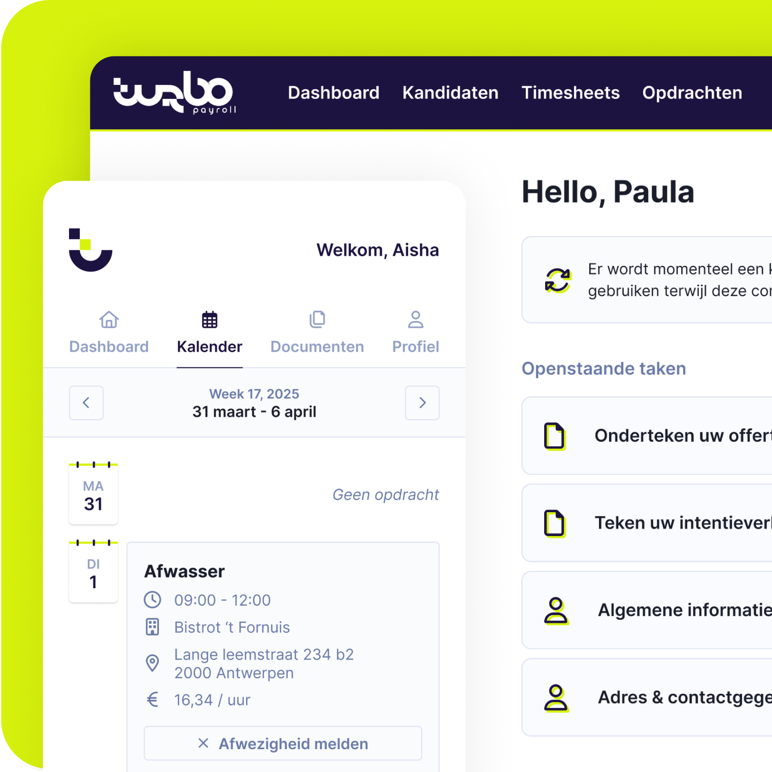 Heb je last-minute extra hulp nodig? Met TurboPayroll maak je eenvoudig zelf een contract aan, en binnen het halfuur kan je flexi starten – volledig wettelijk in orde.